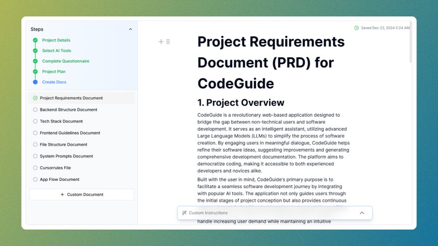 Ban đầu, CJ sử dụng mô hình o1 để tạo tài liệu dự án vì khả năng suy luận tốt của nó. Tuy nhiên, quá trình này tốn khoảng 7-8 giờ và chi phí khá cao (o1 pro có giá $200). Để giải quyết vấn đề này, anh đã phát triển CodeGuide - một công cụ tự động viết tất cả các tài liệu cần thiết với cấu trúc tối ưu.
